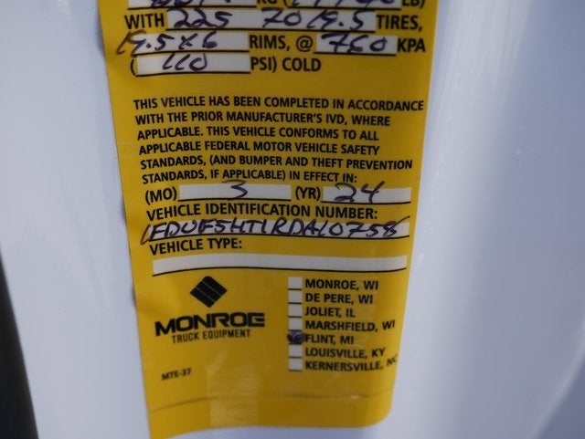 2024 Ford F-550SD XL DRW w/Dump Body 4WD 2D Standard Cab, 9' MTE D-Series Stainless Steel 3-4 YD Capacity Rigid Side Dump Body, 10 Ga Floor/Sides/Ends, 16 H Double Wall Sides, 22 Tailgate, 45,000 PSI Yield Strength Stainless Steel Floor/Sides/Ends, Internal Dirt Shedding Top Rails and Tailgate, LED FMVSS108 Lights and Reflectors, Rubber Rear Flaps, Undercoated, Air Conditioning, AM/FM Stereo w/MP3 Player, Bright Grille, Chrome Front Bumper, Cloth 40/20/40 Split Bench Seat, Engine Block Heater, Halogen Fog Lamps, High Capacity Trailer Tow Package, Limited Slip w/4.30 Axle Ratio, Platform Running Boards, Rear View Camera & Prep Kit, Remote Start, SYNC 4 Communications & Entertainment System, Wheels: 19.5 x 6 Argent Painted Steel, XL Chrome Package. Oxford White, Power Stroke 6.7L V8 DI 32V OHV Turbodiesel, 10-Speed Automatic.